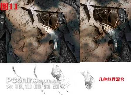C:露出的机械胸口太亮,和残破锈迹的风格不相符。打开颜色层,用上面制作人物裂痕和背景纹理的方法制作出裂纹,放置在“颜色层之下,人物裂痕层之上”如图11。