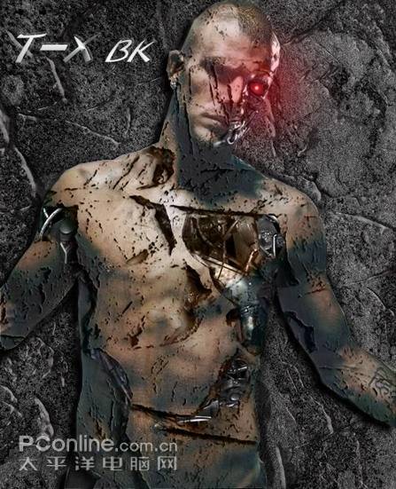 到此,经过换脸、换背景、拼接体内的机械等移花接木的过程,新一代(虽然是残破的)终结者就诞生了。效果图北极选了一张自己比较喜欢的,如果想让小贝终结者更残破,只要将“人物裂痕层”复制几层就OK了,反之要减少层次不