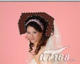 6、 接着,我们要把“人物B”头部多余的部分抠掉。因为是单色背景,所以,使用“魔棒”工具就可以。从“工具栏”中选择“魔棒”工具,点击除了头发外的其他咖啡色的区域,这样就选中了我们所要抠掉的部分,如图8:
