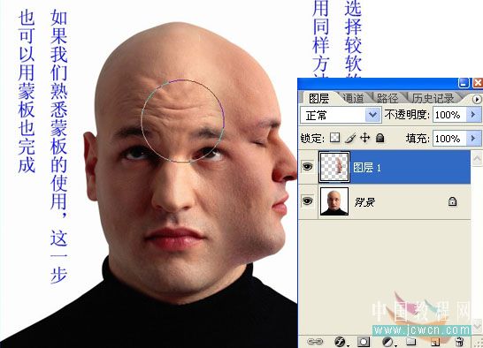 2.打开正面头像,粘贴侧面头像,用矩形选框选中多余部分,Del键删除。移动至合适位置