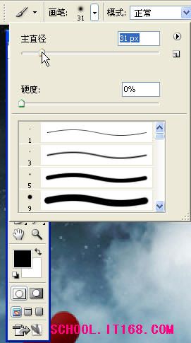 14、将前景色设置为黑色。然后单击工具箱中的“画笔”工具,在出现的属性工具栏中设置好画笔的主直径大小以及合适的硬度。