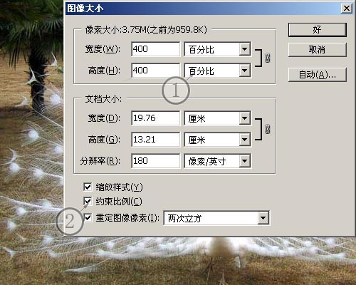 1、为了保证最终图像的清晰,我们需要把图像放大,在完成抠图之后再把图像缩小回原始大小。注意这里的“放大”不是用放大镜工具放大观看,而是将图像整体用“图像”-“图像大小”命令放大,如图所示,将单位改为百分比,勾选“约束比例”,把图像宽高都设置为原来的400%,单击好,图像被放大。