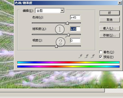 使用“图像”-“调整”-“色相饱和度”命令,如图所示,将颜色进行调整,把黄色的草地变为绿色的。同时将颜色饱和度提高。