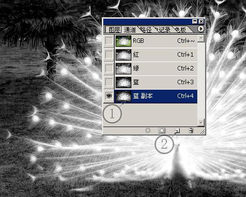 3、经过这样的调整之后,如标签1所示,在蓝色通道中,黑白最为分明,就用这个通道来制作吧。将蓝色通道拉到新建按钮上,将它复制一份。