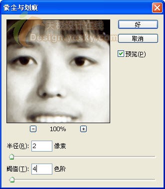 8、选择菜单栏中的“滤镜”“杂色”“蒙尘与滑痕”命令,弹出“蒙尘与滑痕”对话框,参数设置如图07所示,单击好后画面效果如图08所示。