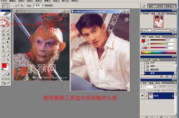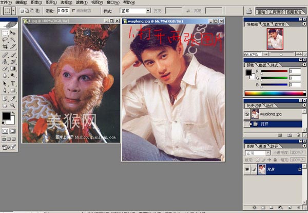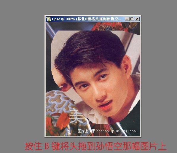 第三步: 按住B键(在英文输入法下,以下也一样)将吴奇隆的头部拖到孙悟空图片上面。