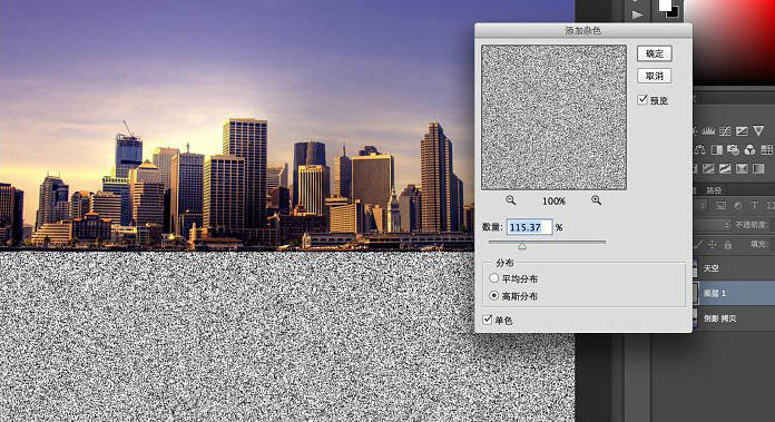 12、点选滤镜栏-杂色-添加杂色,数量大家可以根据感觉调整,这里建议不超过170,选择高斯分布和单色。