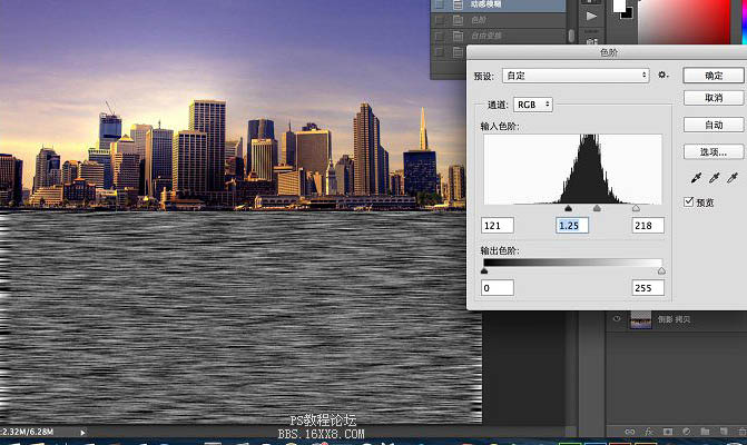 14、command+L,调出色阶命令,调整明暗的对比,如上图所示效果就差不多,过黑的话后面图层混合效果就会偏黑,水纹的纹理不自然(如果是黑夜的水纹倒影,暗场数值高点可能会比较合适,有兴趣的同学不妨试试)。