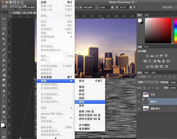 15、调整完后,我们再来做一个透视效果,令这个水纹更自然和谐点。选择变幻-透视,将编辑框顶部向内收缩,底部向外拉,如上图所示,回车确定。
