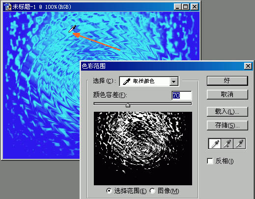 7、菜单命令:选择→色彩范围。以便自己随意选择要定义的颜色,单击左边的吸管在水面波纹的亮部单击,如图七所示。