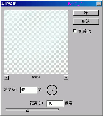 副本”为当前图层,菜单命令:滤镜→模糊→动感模糊。设置参数为图十所示。然后选择“图层1”为当前图层,再次执行菜单命令:滤镜→模糊→动感模糊,设置参数:将角度由“45”度改为“-45”度。