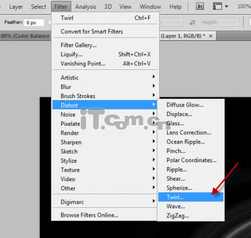 3、执行“滤镜—扭曲—旋转扭曲”,如图所示。