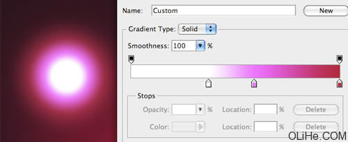 2、现在让我们创建即将要添加条纹的光线。首先创建一个新层,设置它的混合模式为滤色。然后使用椭圆选框工具画一个圆形选区。使用20像素的羽化(选择>修改>羽化)。这将使光周围的边缘有很棒的发光效果。使用径向渐变填充工具,我们要给它一些颜色和强度。我喜欢用3种渐变颜色。第一个和最内部的颜色应该是白色或接近它的颜色。确保你从选区中间开始填充,在边缘结束。