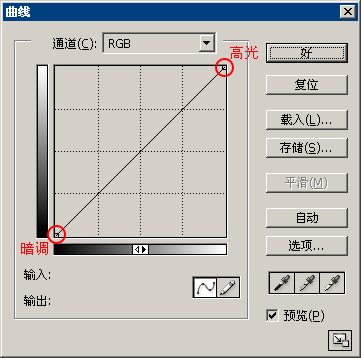 4、在曲线面板中那条直线的两个端点分别表示图像的高光区域和暗调区域,直线的其余部分统称为中间调,两个端点可以分别调整。