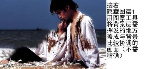 2.接着隐藏图层1,用图章工具将背景层需要挥发的地方盖成与背景比较协调的画面。