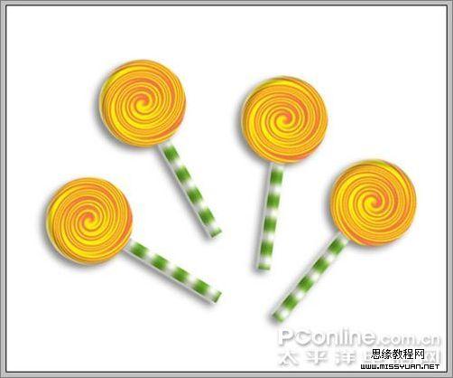 本教程介绍棒棒糖的简单制作方法,思路:先定义好糖面的颜色,然后使用半调图案制作出色彩相间的图案效果,再执行极坐标制作出棒棒糖面效果,用椭圆选区工具复制出来加上样式效果,同样的方法也可以制作出其它颜色的效果!