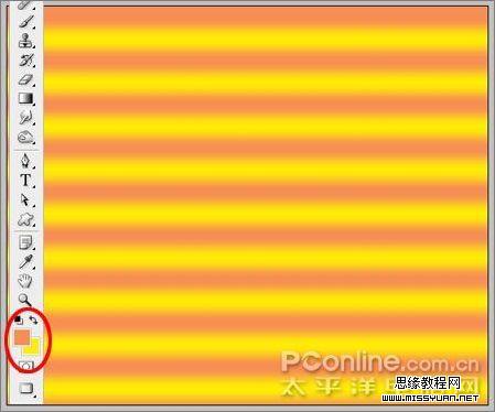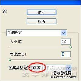 CS3,新建一个文件,设前景色为橙色,背景色为黄色,执行滤镜/素描/半调图案,设置如下,得到橙黄色相间的条纹图案。