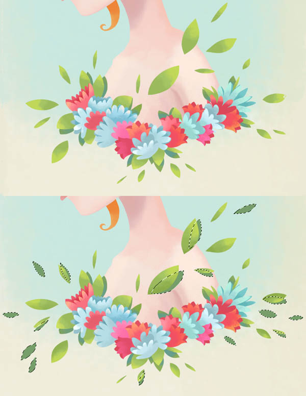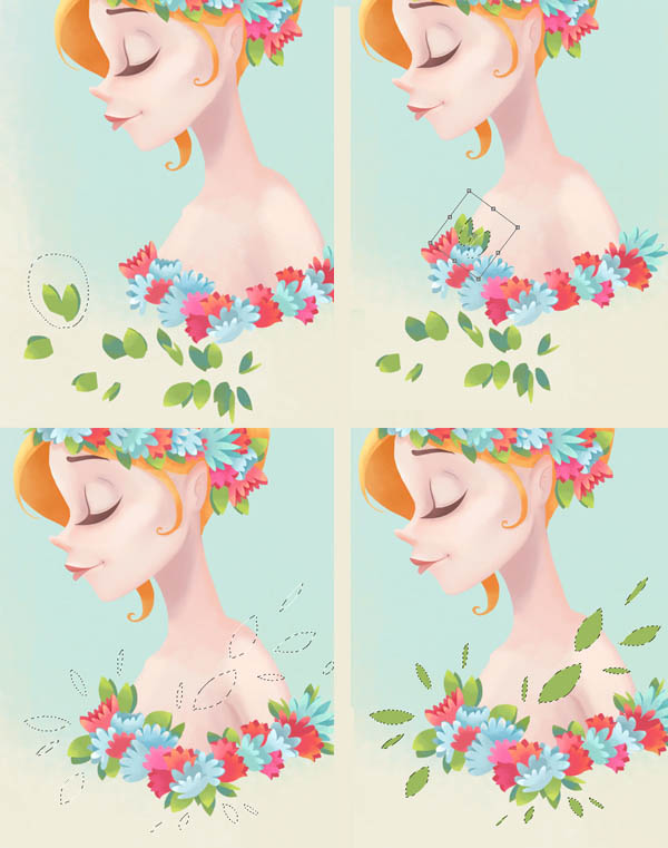 31、从头部的花圈开始复制树叶图层,使用套索工具(L)一个一个的选择树叶,并使用Ctrl+T对其进行自由变换。移动树叶到合适的位置,将他们放在女孩胸部位置的花的后面,在叶子周围画一些虚线让他们看上去被风吹动。