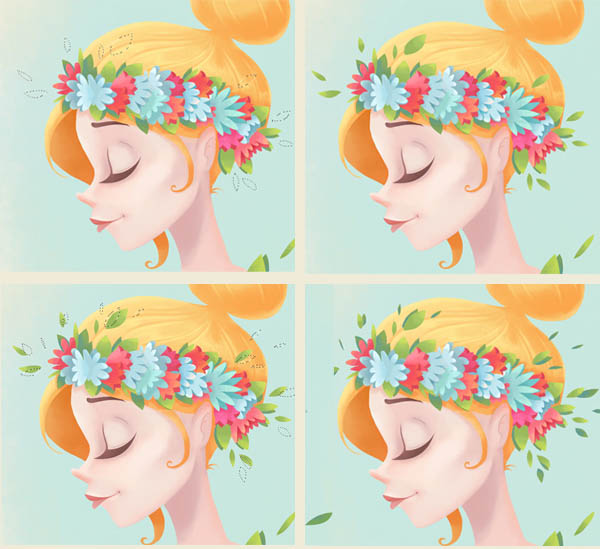 33、在女孩头部周围加一些相似的叶子状点,让画面看起来更生动。