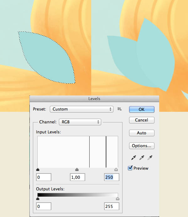 34、让我们继续我们草图里面描绘的下一个细节:一个优雅的花苞头。使用套索工具开始形成一个蓝色的花瓣,重复花瓣,改变它的位置。保持新的花瓣的选中状态,打开色阶属性面板(Ctrl+L),移动右侧滑块(白色的)向左一点点,让花瓣的颜色更亮。