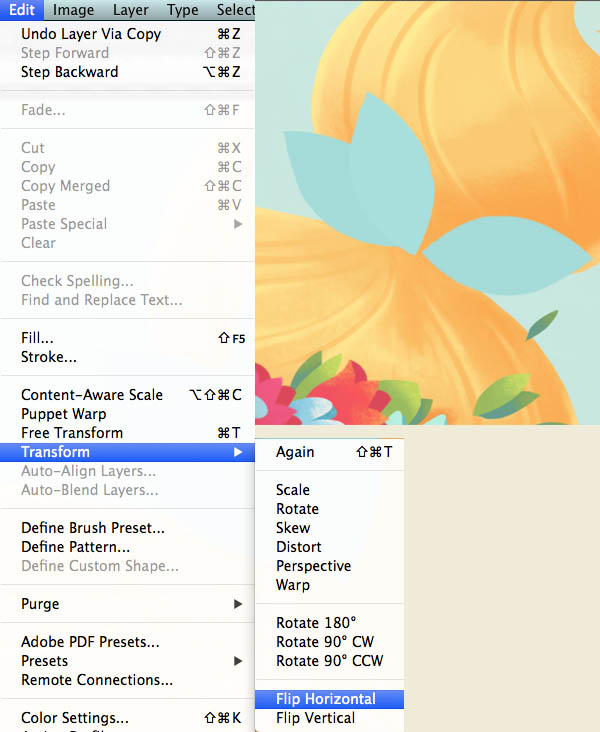 35、重复最初的花瓣,通过编辑>变换>水平翻转,在垂直轴上创造一个镜面的副本。移动镜像的花瓣到发苞的另一边。