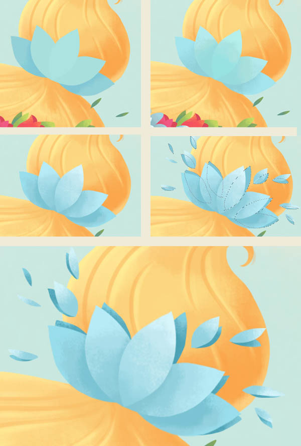 36、复制并形成更多花瓣,构成一个对称的莲花。选取画笔工具(B),选取[软油彩蜡笔]笔刷在头发上方的花瓣上添加轻微的斑点,添加几组从莲花向外散射的细小花瓣组。在下面添加深色花瓣,塑造光影效果,使花瓣更加立体。