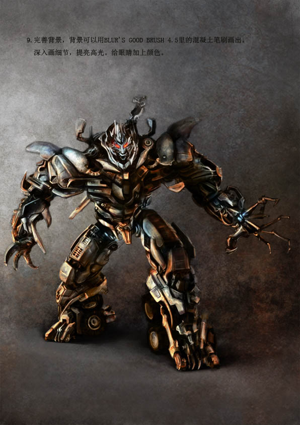 9、完善背景,背景可以用混泥土笔刷。然后深入细节,提亮高光,再给颜色加深颜色。