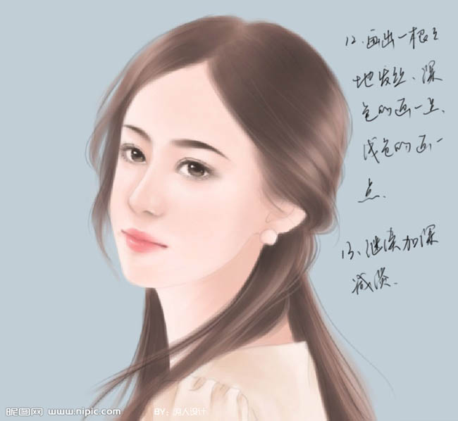 12、画出一根根的发丝,深色的画一点,浅色的画一点。然后继续加深减淡,就完成了。