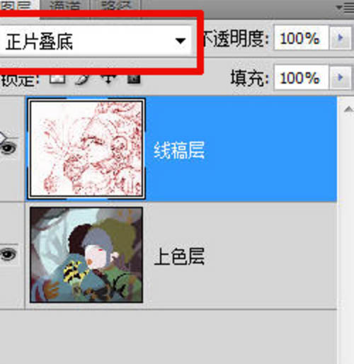 6、将线稿图层属性设置为【正片叠底】线稿层下面的一层就是上色层了,这样我们进行上色的时候就不会影响到上面的线稿层了。