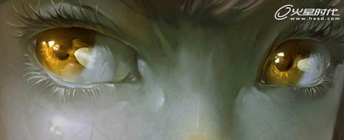 18、再看这张画的眼睛里面,反光部可以清楚的看到一个人的面部的亮部(找找看),我们只要把光滑的东西想象成一面半透明的镜子就好了。
