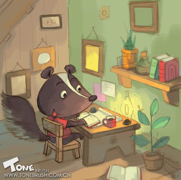 这里要考虑的问题主要就是色彩的搭配、光线的布局以及画面色彩冷暖变化的安排,儿童插画中一般会特别强调画面中的冷暖对比,希望通过强烈的对比可以更好的衬托出画面的趣味性。另外需要注意的是我们的大色块的颜色是在线稿层的下面新建一个图层来描绘的。
