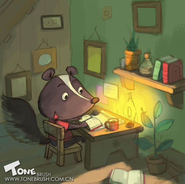 7、新建一个图层,选择一个暖色用喷枪将油灯附近的颜色提亮,并将图层施与“强光”的图层属性,让油灯的光感更加强烈。至此,我们的大色稿就算完成了,后面的深入刻画将牢牢以现在的色彩关系为基础逐步展开。