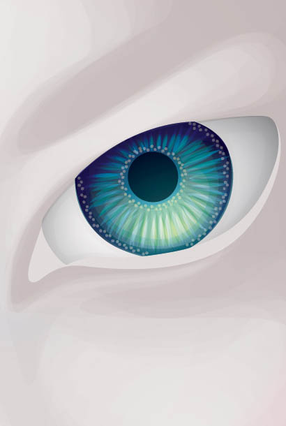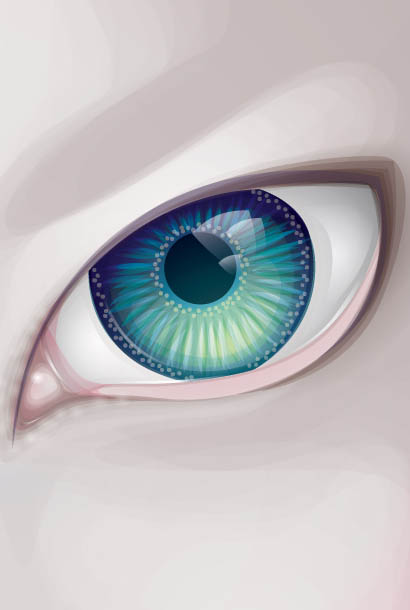 9、现在添加透明的径向渐变,笔刷描边和点,以增加眼睛的细节。我使用各种混合模式和不透明度,给予一个有趣的对比效果。眼内的描边使用了多种颜色,使用较低的不透明度和渐变达到不错的效果。(大家按下图试着用自己的方法画一下)