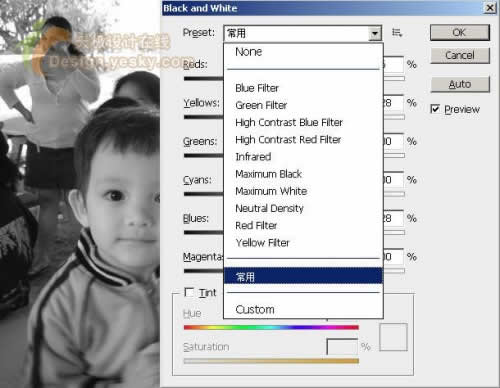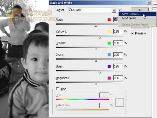 5.还可以将自己调好的数值保存起来,以备日后再次使用,例如在数码影楼工作的朋友,当需要将大量类似的彩色照片转为黑白照片时,根据照片冲印效果积累出一定经验后,可能某一组数值是最合适的,那么就可以这样做。方法是在调好6组颜色数值后,单击“Preset”(预设)右方箭头右侧的那个小按钮,这时就会看到如图5所示的菜单,单击“Save