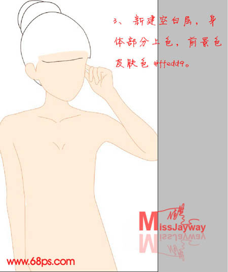 3、新建一个图层,把前景颜色设置为:#ffedd9,简单把肤色部分上色,效果如下图。