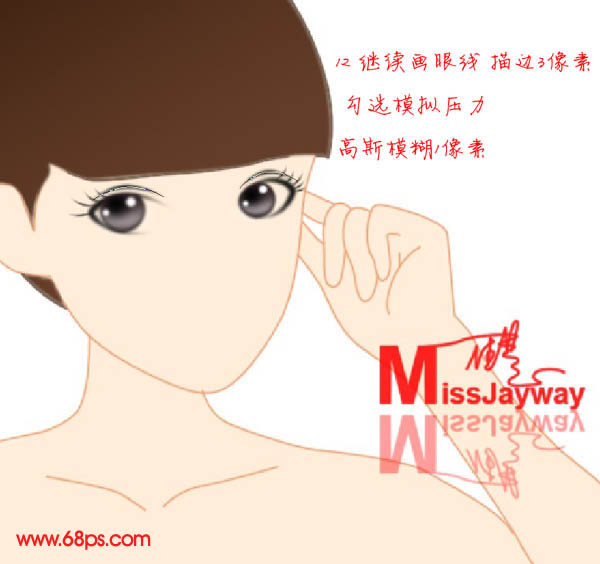 12、继续画眼线,新建一个图层用钢笔勾出眼线部分的路径,然后描边3像素,勾选模拟压力。确定后再高斯模糊1个像素。