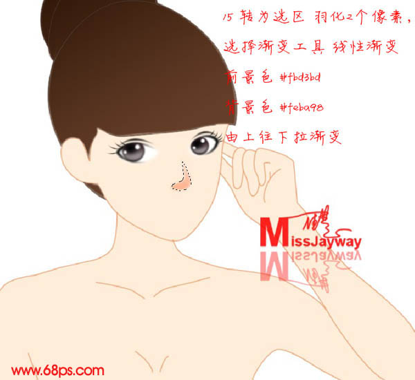 15、转为选区,羽化2个像素。选择渐变工具,颜色设置为:#fbd3bd至#feba98的线性渐变,然后由上至下拉出下图所示的渐变色。