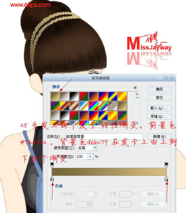 25、头发上画个发夹,用钢笔勾出路径后拉上下图所示的线性渐变。