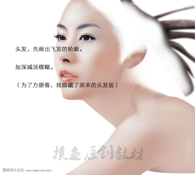 13、头发部分的制作。先画出飞发的轮廓,适当加深,减淡及模糊处理。
