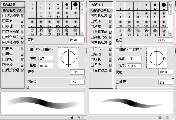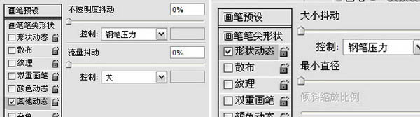 7、选择“其他动态”的时候,在“其他动态”的附属面板里将“不透明度抖动”下的“控制”按钮选择为“钢笔压力”,这样笔刷就有了一个不透明度的抖动。同样,选择“形状动态”的时候,在它附属面板里将“大小抖动”下的“控制”按钮选择为“钢笔压力”,这样笔刷就有了大小抖动。