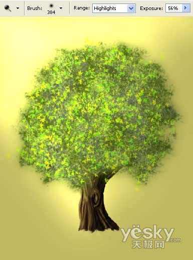 17、用加亮工具给画面的左上角、树冠以及树干轮廓部分加亮,增加阳光普照的画面效果。