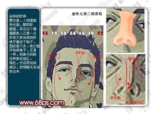 涂抹的时候要注意,人物面部受光面,其实这个漫画跟真人还差一点,所以大家涂抹的时候尽量动下脑子,涂的差不多,我们就开始做鼻子,还是一样,把鼻子的路径转换成选区,填充,然后用加深/减淡工具把明暗关系涂出来。