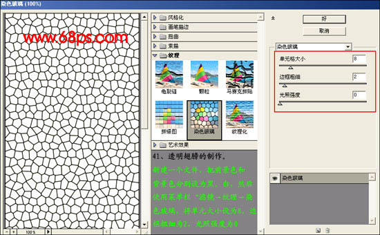> 纹理 > 染色玻璃,将单元大小设置为8,边框粗细设为2,光照度设为0。