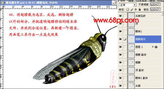 + Shift + I反选,删除翅膀以外的部分,并把透明翅膀移到蝗虫源文件,并放到合适位置,再新建一个图层,用画笔工具做出一点高光效果。