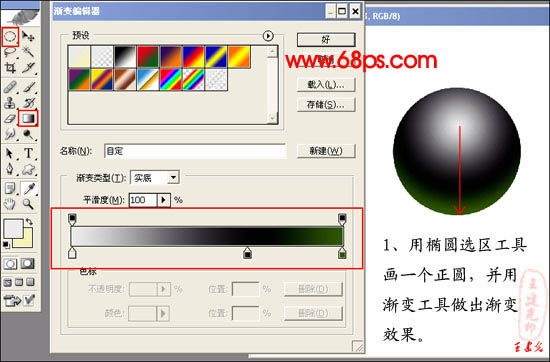 * 800像素文件,用椭圆选框工具拉一个正圆,选择渐变工具,颜色设置为黑白渐变如下图左,拉出下图右的径向渐变效果。