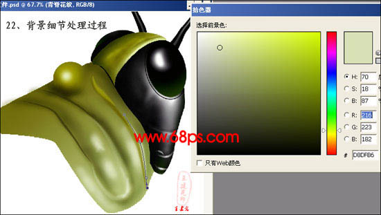 19、亮部也使用以上相同的方式进行处理,前景色设为:6B6910,再进行画笔描边。
