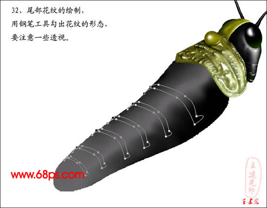 32、尾部花纹的绘制,用钢笔工具勾出花纹的形态,要注意一些透视。