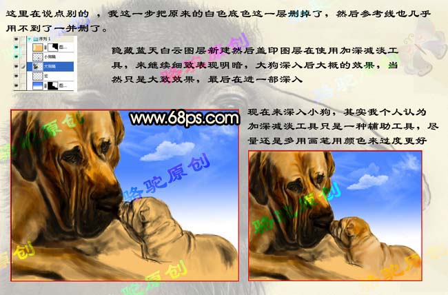 隐藏蓝天白云图层,然后盖印图层图层,再使用加深/减淡工具,来继续细致表现明暗,大狗深入后大概效果如下图,当然只是大致效果,最后再进一步深入。