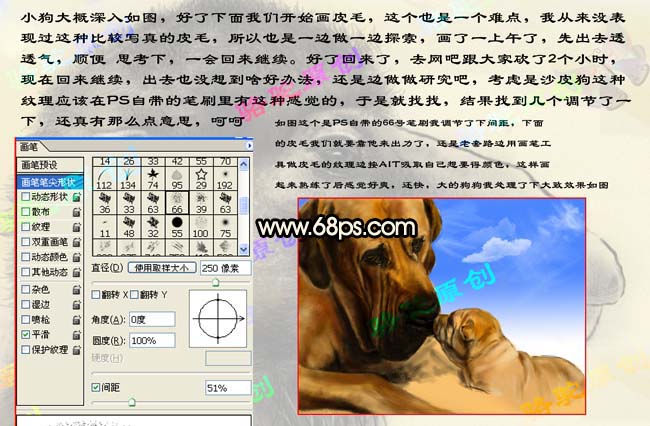 如图这个事PS自带的66号笔刷,我调节了下间距,下面的皮毛我们就要看他来出力了,还是老套路边用画笔工具做皮毛的纹理边按Alt键吸取自己想要的颜色,这样画起来熟练了以后感觉好爽,还快,大的狗狗我处理了大致效果如下图。