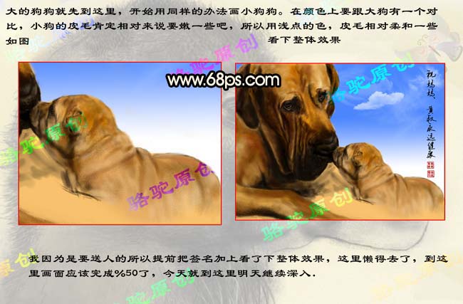 7、大狗我先画到这里,开始用同样的方法画小狗。在颜色上跟大狗有一个对比,小狗的皮毛稍微嫩一点,所有用浅色,皮毛相对柔和一下如下图。